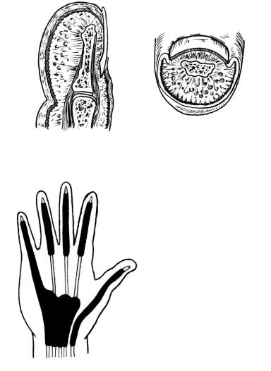2)соединительнотканный слой клетчатки тонкий и мало предохраняет от повреждения глубже расположенные, малоустойчивые к инфекции ткани – сухожильное влагалище, кость, сустав; к тому же особенность строения клетчатки пальца, разделенной соединительнотканными волокнами на мелкие доли (рис. 49), благоприятствует распространению инфекции в глубину пальца и быстрому омертвению пораженных участков пальца;