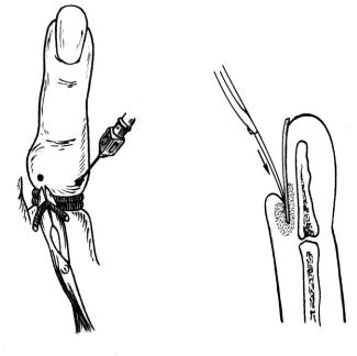 сти рассекают продольными разрезами на границе ладонной и боковой поверхностей соответствующей фаланги пальца.