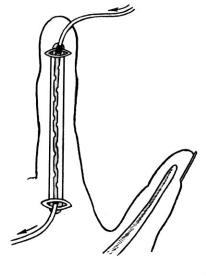 рация заключается во вскрытии сухожильного влагалища с обоих концов, эвакуации гноя, промывании раствором антисептика и активном дренировании полости влагалища длительным промыванием антисептиками (рис. 54). Если прои-