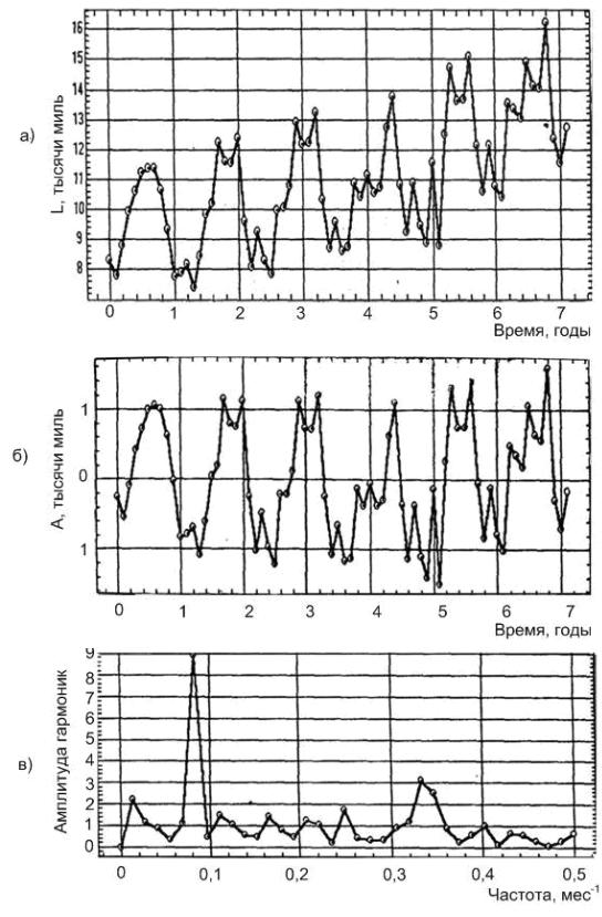Выделение и вычитание тренда приводит к сигналу вида, изображенного на рис. 1.15, б. Спектральный анализ этого сигнала позволил выделить сезонную компоненту с периодом ~1 год и другую компоненту с периодом 3 месяца.