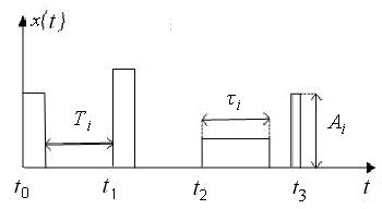 На рис. 1.22 изображена случайная последовательность прямоугольных импульсов. Такими потоками описываются процессы в радионавигационных, радиолокационных и других системах. Например, продолжительность работы любой технической системы может быть поставлена в соответствии с длительностью импульса i , время ее восстановления (ремонта) – длительностью паузы Τi . Амплитудой импульса Αi характеризуют эксплуатационный показатель системы (пробег автомобиля, вес перевезенного груза и т.д.).