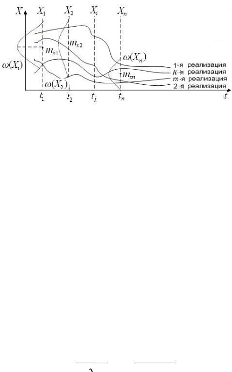 распределение вероятностей реализаций. При его построении принимается за основу базовое положение: при фиксированном значении аргумента значения функции есть набор значений случайной величины. При дискретизации аргумента СП через интервал t получим систему случайных величин. Каждая из этих величин Хi={xi1, xi2,…xik,…, xim} описывается плотностью распределения вероятностей ω(Хi), i=1,2,…,n (рис. 1.4). Если Х1, Х2,…,Xn независимы, дифференциальный закон распределения вероятностей СП определяется соотношением