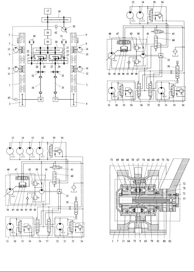 Рабочая жидкость насоса 38 поступает через подводящий канал 78, продольный канал 76 цапфы 77 в полость кольцевой канавки 74 и оттуда в рабочие полости 67 гидро- мотора. Поршни 66 перемещаются, передавая нагрузку на шарики 68, взаимодействующие с шайбами 69, закрепленными на валу 71. Из рабочих полостей 67 рабочая жидкость по- ступает в полость кольцевой канавки 75 и через кольцевую канавку 79 и отводящий канал 80 аксиально-поршневого гидромотора 13 на слив в бак 48 гидросистемы. Блок цилиндров 64 активного катка 7 проворачивается, приводя в движение каток 7 и звездочку 9. Анало- гично посредством гидромоторов 14, 15, 16 активизируются катки 7, 8 и ведущие звездоч- ки 10, 11, 12 бортов. Поскольку звездочки 9, 10, 11, 12 имеют постоянное зацепление с гусеничными цепями 1, 2, появление дифференциального эффекта при параллельной ра- боте гидромоторов 13, 14, 15, 16 исключается.