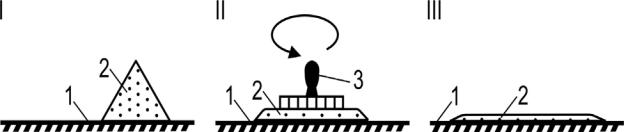 Рисунок 6.1 - Последовательность работ при определении параметров шероховатости: 1 - поверхность покрытия; 2 – песок;