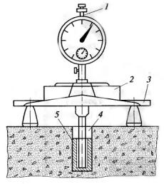Рисунок 7.1 – Прибор для измерения износа материала покрытия 1-Индикатор часового типа, 2-фиксирующий зажим, 3-опорная площадка, 4-место для заглушки, 5-стаканчик-репер.