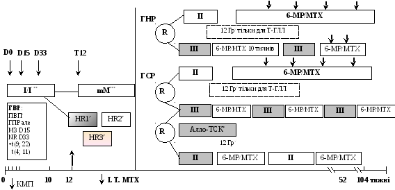 У пацієнтів з вкрай несприятливим прогнозом (наявність несприятливих хромосомних аномалій, комбінація ряду прогностично загрозливих факторів і погана відповідь на стандартний обсяг хіміотерапії) показано проведення алогенної трансплантації у першій ремісії захворювання: абсолютно показаною є алогенна трансплантація кісткового мозку при наявності несприятливих хромосомних аномалій t(9;22) і t(4;11), а також при комбінації декількох несприятливих факторів, включаючи Т-клітинний фенотип, погану відповідь на ініціальну преднізолонову профазу, і, безумовно, при відсутності повної гематологічної ремісії після завершення I фази Протоколу I.