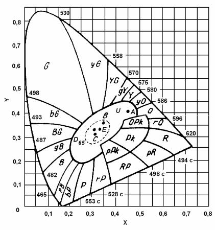 воспринимаемой частоте цвета, исключая введение розовых цветов, и не изменяются при изменении яркости. Не было предложено наименование цвета большой центральной области овальной формы, обозначенной буквой U. Цветовые тона цветов, представленных цветностями, находящимися в этой зоне, изменяются на границах от неопределенного до едва уловимого.