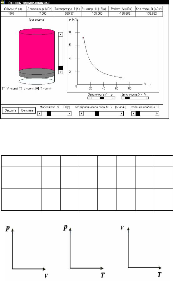 1.Выберите в окне программы значение массы газа, степень свободы и молярную массу газа (рис. 3). Занесите в табл.2 начальные параметры газа. Для проведения с газом изохорного процесса необходимо рядом с буквой V установить флажок.