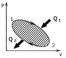 По закону сохранения энергии работа не может совершаться просто так, при ее совершении должно происходить изменение энергии некоторых тел, т.е. должен быть некоторый источник энергии. В данном случае энергия дается системе при проведении процесса 1–2 в виде количества теплоты Q1. Рассмотрим теперь процесс 2–1. Так как проведение его невозможно без передачи системой внешним телам некоторой энергии, то он будет сопровождаться выделением системой количества теплоты Q2.