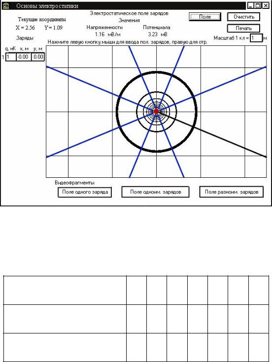 2. Выбрав масштаб – по указанию преподавателя, например, 1 клетка = 2 м, снять с помощью программы зависимость значения напряженности и потенциала от расстояния до заряда. Зависимость снять вдоль оси X через 1 м для 7 точек. Данные занести в табл. 1.