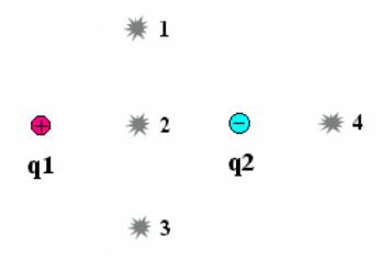 1.Ввести с помощью «мыши» 4 точечных заряда величиной, например, 1 нКл, но различных знаков в точках с координатами
