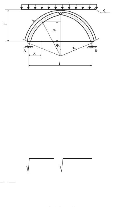 продольной силе расчет сечения производят на внецентренное сжатие. При определении гибкости расчетную длину элементов принимают: для двухшарнирных арок при симметричной нагрузке lo=0,35S, а для трехшарнирных арок при симметричной и несимметричной нагрузке, а также для двухшарнирных арок при несимметричной нагрузке lo=0,58S, где S – полная длина дуги арки.