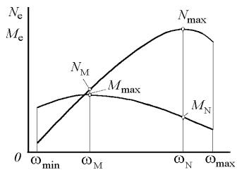 Минимальную угловую скорость вращения wmin вала для всех двигателей задают в пределах 50…100 рад/с. Максимальную скорость wmax вала бензинового двигателя выбирают в пределах (1,1 … 1,2) wN. Для дизельного двигателя скорость wmax ограничена всережимным регулятором: wmax = wN.