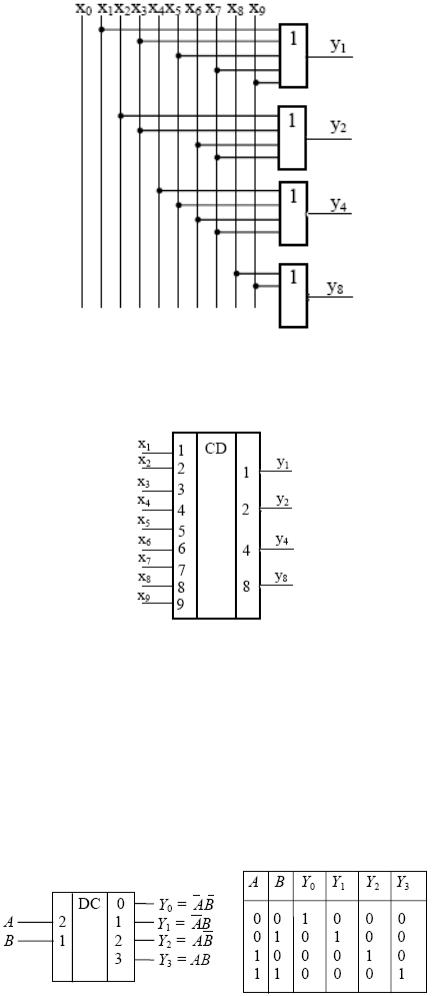Кожній кодовій комбінації на входах дешифратора відповідає активний рівень тільки на одному з виходів. Умовне графічне позначення і таблиця істинності повного дешифратора на два входи (n = 2) зображені на рисунку 1.6.3. Логічна одиниця формується на тому виході дешифратора, адреса якого відповідає набору двійкових сигналів на входах А та В.