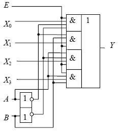 Для комутатора з чотирьох входів Хi на один вихід Y (рис. 1.6.7) вихідний сигнал пов'язаний з вхідними співвідношенням Y E( X 0 A B X1 AB X 2 AB X 3 AB) .