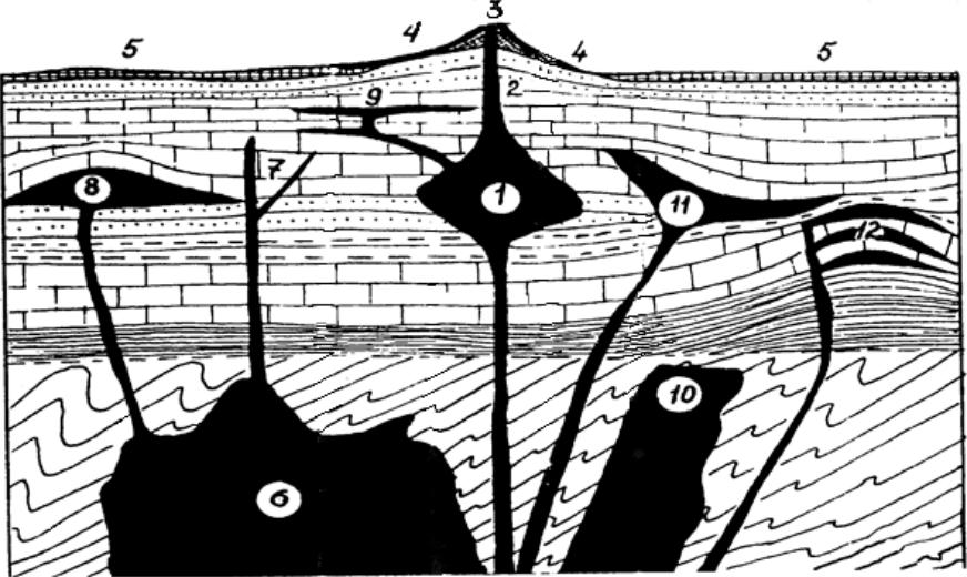 1 – вулканический очаг; 2 – жерло вулкана; 3 – конус (купол) вулкана; 4 – лавовые потоки; 5 – покровы; 6 – батолит; 7 – дайки; 8 – лакколит; 9 – силлы ( пластовые жилы); 10 – шток; 11 – лополит; 12 – факолиты