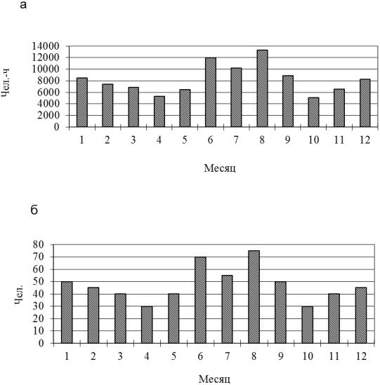 Рис. 7.1. Эпюры трудозатрат: аД– потребность чел.-ч по месяцам;