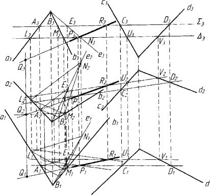 Найдены точки Р = (С, D)f](А,В,Е) и R = UVC\(L,M,N). Пря мая (Р,R)есть прямая пересечения гиперплоскости (а,Ь,е) и плос кость (c.d).