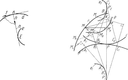 кривой О.. Следовательно, неподвижной центроидой непрерывного плоскопараллельного перемещения репера кривой служит ее эволюта. Очевидно, подвижной центроидой движения репера служит нормаль ная прямая п. В таком случае кривая линия а представляет собой траекторию движения точки А, неизменно принадлежащей прямой линии т?, когда, последняя обкатывает кривую е, то есть линия а есть рулетта точки А, принадлежащей подвижной центроиде п, обкаты вающей неподвижную центроиду е. Это как раз соответствует ранее изложенному кинематическому образованию эвольвенты а по ее эволюте е.