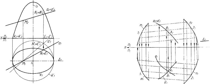 Определим точки пересечения эллипсоида вращения 0 и прямой линии а (рис. 7.18). В соответствии с предложенным выше алго ритмом заключим прямую а в проецирующую плоскость 7*17/,.