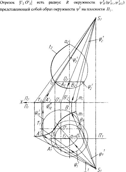проведенный из ее центра F(FY , F2 ), 1 и 2 - диаметрально противо положные точки окружности у/1. Эта сфера пересекает плоскость от ображения /7, которой принадлежит центр сферы, по большой ок ружности У л О / ш ^ л г ) ' которая и является образом выбранной окружности у/х на поверхности Q.