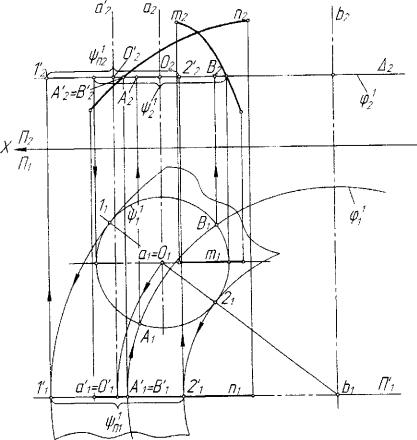 образующих окружностей, А - плоскость параишлизма (рис. 7.29). В соответствии с логикой алгоритма 7.2 может быть предложена ниже следующая последовательность определения точек линии пересече ния заданных поверхностей.
