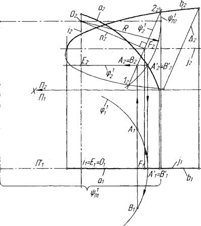 лим несколько точек линии пересечения двух поверхностей вращения ©(bji) и Q(a,m) с параллельными осями а и Ь и образующими - кривыми линиями тип (рис. 7.27). Последовательность алгоритми ческих действий и конструктивных построений может быть нижеследующей: