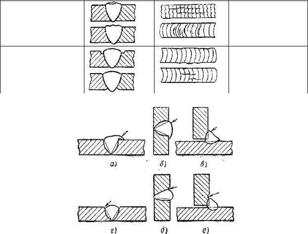 Рис. 1.3. Наплавы (а – в) и подрезы (г – е) в сварных швах, |