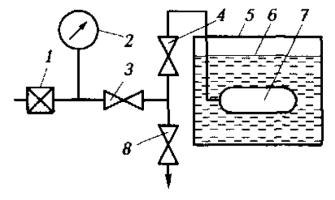 Рис. 3.2. Схема пузырькового методаИконтроля: 1 – редукционный клапан; 2 – манометр;