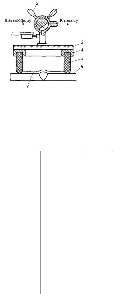 Наибольшее распространение получил контроль герметичности объекта с использованием гелиевой камерыИили вакуумных присосок. В первом случае испытуемый объект помещают в заполненную гелием камеру, вакуумируют ее до необходимого остаточного давления и фиксируют ее до необходимого остаточного давления и фиксируют прибором появление ионов гелия внутри объекта в случае его негерметичности. Во втором случае на наружную поверхность проверяемого объекта, заполненного гелием под некоторым избыточным давлением, накладывают вакуумную камеру, в полости которой создают разрежение (рис. 3.3). Появление в камере ионов гелия, сопровождающееся образованием вздутий в пленке пенообразующего вещества, свидетельствует о наличии течи. В обоих случаях появление гелия в вакуумированном объеме изделия фиксируется с помощью гелиевого течеискателя.
