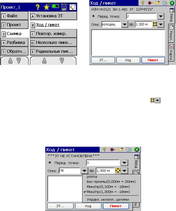 необходимо перейти к процессу съемки. Для этого в программе тахеометра выбирается пункт меню «Съемка» и пункт подменю «Ход/пикет» (рис. 62).