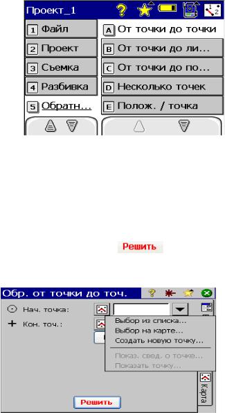 Для независимого контроля полученного результата в задании предусмотрено решение обратной геодезической задачи для двух точек установки тахеометра. Координаты первой – берутся из первого задания, координаты второй – из решения обратной линейно-угловой засечки. Для этого необходимо выбрать пункт меню «Обратная задача», пункт подменю «От точки до точки» (рис. 76).