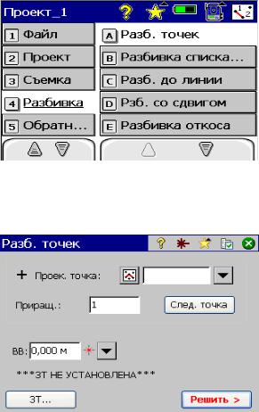 Цель выполнения четвертого задания – вынос в натуру запроектированных точек, которые были нанесены на план в третьем задании. Для этого необходимо установить тахеометр над одним из пунктов, координаты которого были определены ранее. После этого нужно запустить программу тахеометра, выполнить горизонтирование и ориентирование прибора. Затем выбрать пункт меню «Разбивка», пункт подменю «Разбивка точек» (рис. 79).