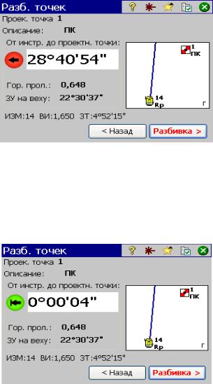 отображается направление, в котором необходимо поворачивать прибор вокруг вертикальной оси, чтобы выставить направление на проектную точку. Чем ближе к нулю