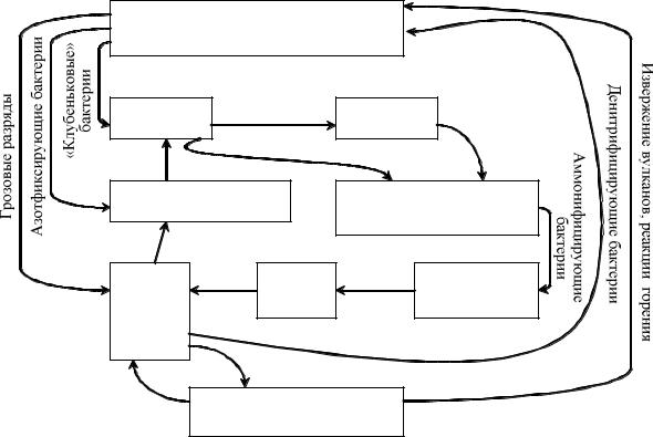 На рис. 8 представлена схема круговорота азота в атмосфере. Газообразный азот атмосферы поглощается азотфиксирующими