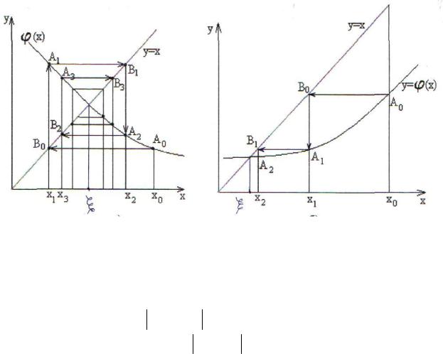 у = (x) с прямой у = x. Взяв в качестве начальной произвольную точку x0 [a, b], строим ломаную линию. Абсциссы вершин этой ломаной представляют собой последовательные приближения корня . Из рисунков видно, что если '(x)<0 на отрезке [a, b], то последовательные приближения xn = (xn-1), колеблются около корня , если же производная '(x)>0, то последовательные приближения сходятся к кор-