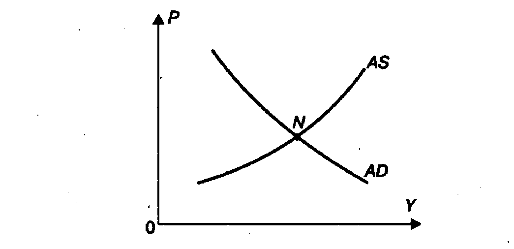 Пересечение кривых AD и AS в точке N отражает соответствие равновесной цены и равновесного объема производства (рис. 25.3). При нарушении равновесия рыночный механизм будет выравнивать совокупный спрос и совокупное предложение; сработает, прежде всего, ценовой механизм.