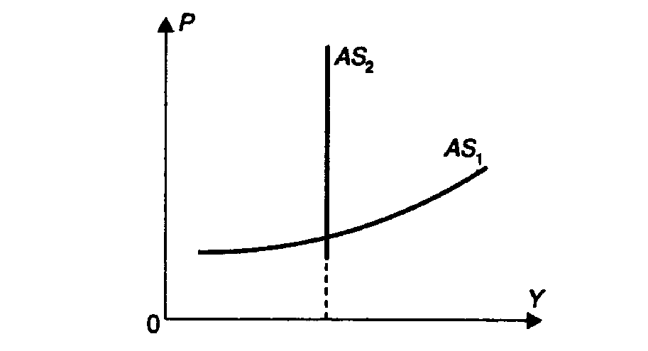 В краткосрочном периоде (два-три года) кривая совокупного предложения согласно кейнсианской модели будет иметь положительный наклон, близкий к горизонтальной кривой (AS1).