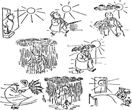 7.wieder, es regnet, ganz naß, ohne Regenschirm und Hut, unzufrieden, böse, nach Hause zurückkehren;