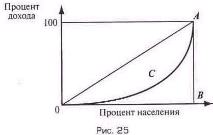 Для измерения неравенства в распределении доходов используется КРИВАЯ ЛОРЕНЦА (рис. 25).