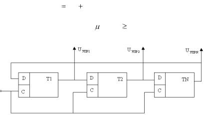 перепад напряжения, который опрокинет триггер Т2. Следующий тактовый продвигающий импульс вернет триггер Т2 в исходное состояние, триггер Т3 перейдет в состояние «1» и т.д.