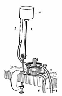 Рис. 5. Схема полевого компрессионного прибора: 1 – телескопическая стойка; 2 – стеклянная трубка; 3 – воронка; 4 – верхняя выводная трубка; 5 – образец грунта; 6 – нижняя выводная трубка.