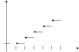 Дискретная случайная величина при переходе через значения xk имеет разрыв. Между двумя соседними значениями она постоянна. Например, график функции распределения для числа очков, выпавших на верхней грани игрального кубика, будет иметь вид, изображенный на рис. 1.