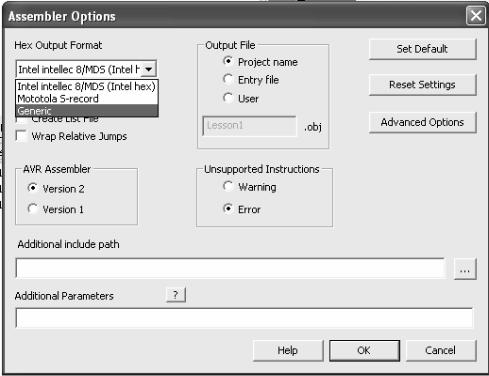 Вобласти AVR Assembler осуществляется выбор между AVRASM2 (версии 2 по умолчанию) и AVRASM. Если у вас есть проблемы совместимости с новым AVRASM2, вы можете использовать старый AVRASM (версии 1). При этом дополнительные параметры и неподдерживаемые инструкции не будут доступны.