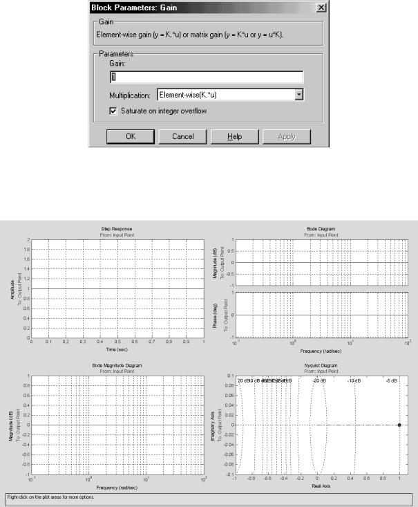 Для изменения коэффициента передачи k усилительного звена необходимо дважды щелкнуть на нем левой кнопкой мыши, появится окно параметров усилительного звена Gain (рис.3.12).