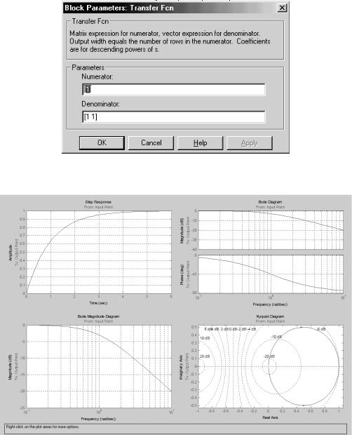 Знаменатель апериодического звена Ts +1, то есть полином вида a0s1 + +a1s0, где a0 = T, а1 = 1. Поэтому в окне Denominator для апериодического звена вводим [T 1] (через пробел).
