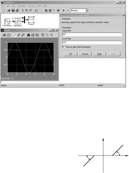 Блок Saturation (звено с ограничением или насыщением) представляет собой нелинейное устройство, сигнал на выходе которого равен входному сигналу до тех пор, пока не достигает порогов ограничения: верхнего Upper limit или нижнего Lower limit, после этого сигнал перестает изменяться.