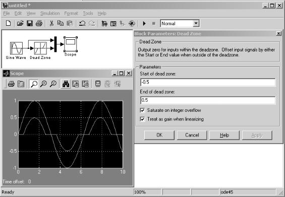 Рис.8.5. Блок с зоной нечувствительности Dead Zone и пример его применения