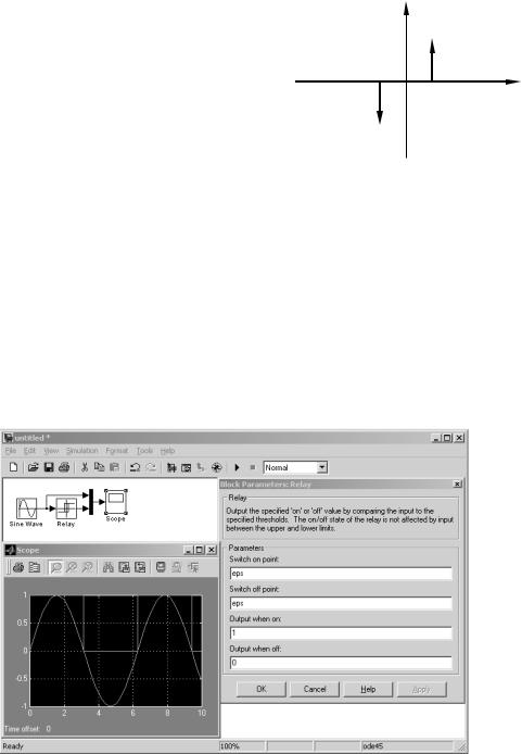 Пример, приведенный на рис. 8.7, показывает работу релейного блока с одинаковыми по абсолютной величине и очень малыми (eps) порогами при подаче синусоидального сигнала на вход.