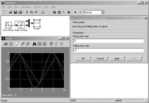 При работе блока вычисленное значение скорости изменения сигнала сравнивается с установленным в окне параметров значением параметра Rising slew rate (скорость нарастания сигнала) и параметра Falling slew rate (скорость спада сигнала). По умолчанию заданы значения Rising slew rate и Falling slew rate, равные 0,5 и – 0,5 соответственно.